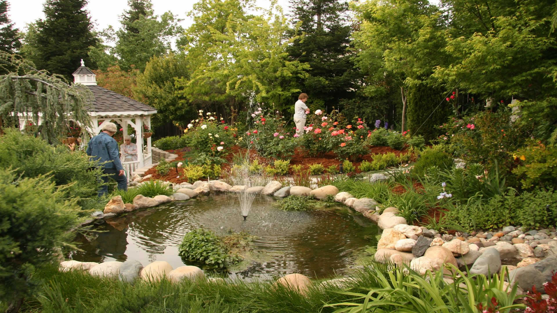 Yeşillikler arasında Kamelyası,fiskiyeli havuzu ve renk renk çiçekleri olan güzel bir bahçe resimi.Doğal olarak bayanların bir raya toplandıkları yer.
