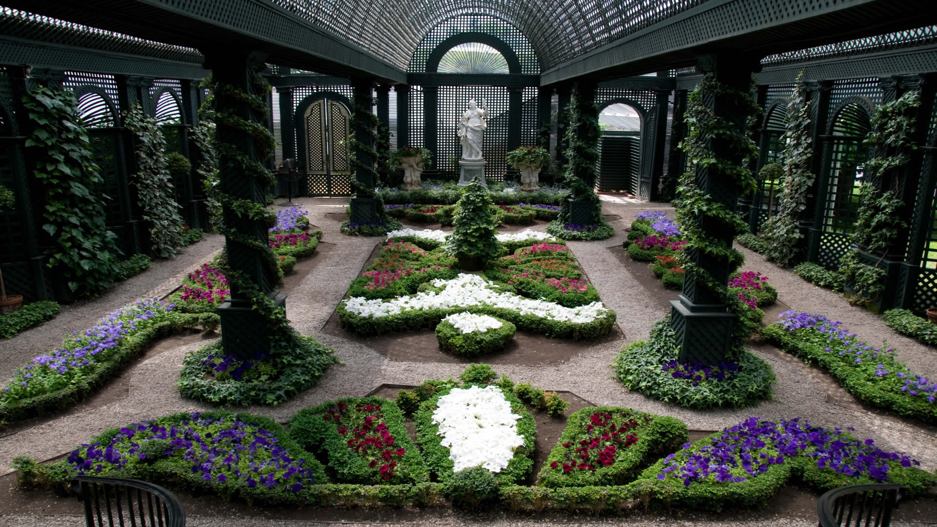 İngilteredeki bir malikanenin üstü kapalı bir bahçesi.İçindeki rengarek menekşe çiçekleri ve sutuları saran sarmaşıklarla oldukça güzel bir bahçe resimi.