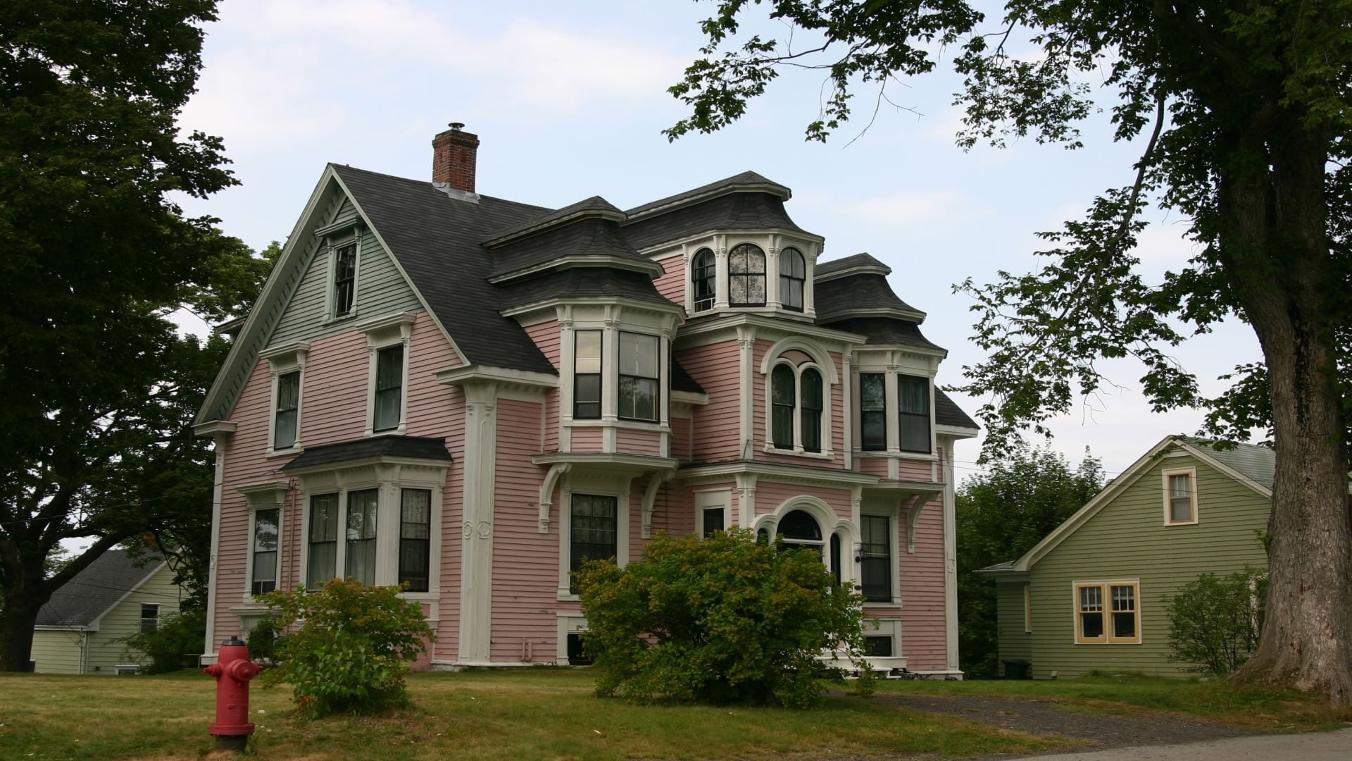 Pembe kaplaması,çatısı ve birkaç tane cumbası oln güzel bir ev.