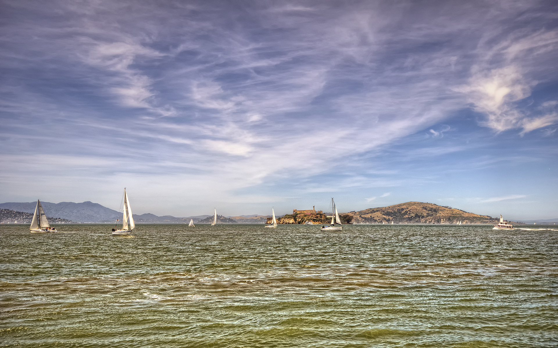 alcatraz adası ve yelkenliler